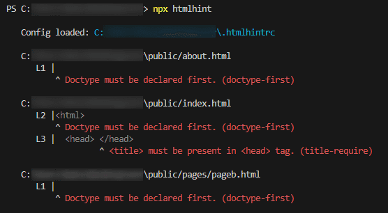 > npx htmlhint "public/**/*.html"コマンドを実行すると次のようにバリデーション結果を出力してくれます。