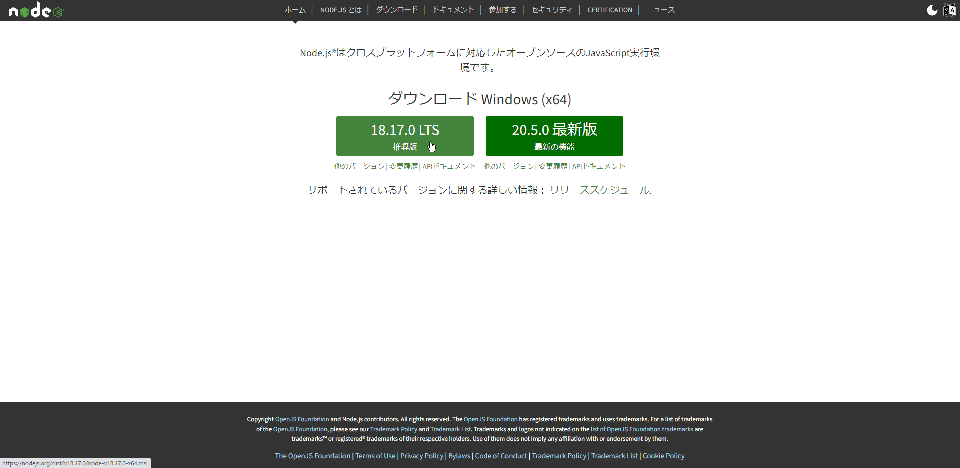まずは、Node.jsの公式サイトにアクセスします。